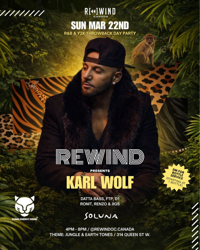REWIND Canada is hosting once again in one of Toronto's most WELL reknowned downtown spaces, inside Soluna. Dress in your favourite Jungle Themed clothing on our St. Patricks Week SUNDAY Day party and vibe to the 2000's best hits, R&B, Hip-Hop, & sing-a-longs that makes you remember all the nostalgic moments growing up. Featuring a SPECIAL performance by Canadian Pop-Star KARL WOLF - this is NOT a Rewind you want to miss!